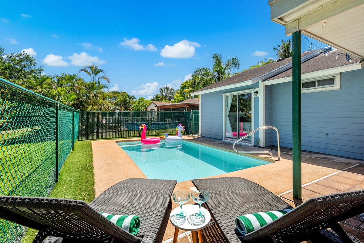 **3/2 Prenočišče z ogrevanim bazenom, mirno zasebno dvorišče v osrčju Jupitra! Blizu kluba Pelican, restavracij, golfa in kave. Čudovito opremljeno s sodobno tematiko iz sredine stoletja, ki se počuti kot na počitnicah. Dovolj prostora za vas in vaše goste, da se sprostite na terasi za sončenje, se sprostite na soncu, ohladite v bazenu ter uživate v miru in tišini. Žarite in uživajte v pomirjujoči večerji na prostem ob sončnem zahodu. Preberite knjigo, uživajte v koktajlu ali si privoščite dolg počitek. Toliko vrednosti, da ne boste nikoli želeli oditi.