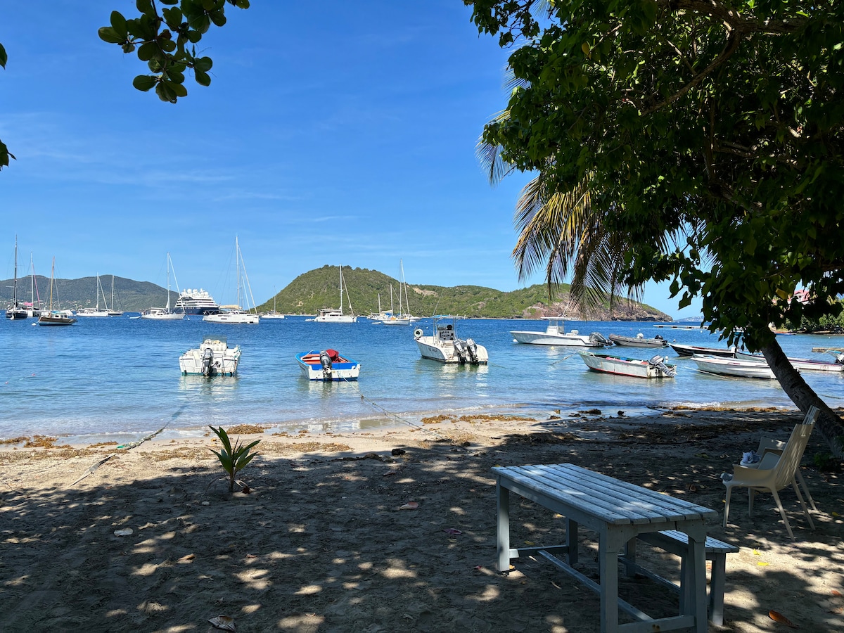 Petit studio calme 14 m2, face à une des plus belles baies du monde, sur la plage d Anse Mire à 8 mn à pied du débarcadère, souvent dispo à partir de 9h du matin sur demande . Chambre : lit 140, lavabo, linge de maison fourni, serviettes, Wifi. Recoin : Kitchenette équipée , douche , WC . Grande terrasse ext , vue mer, table 2 chaises, transats, salon de jardin douche extérieure ... Ce logement est idéal pour une escapade à Terre de haut . Ce logement est attenant à la maison .