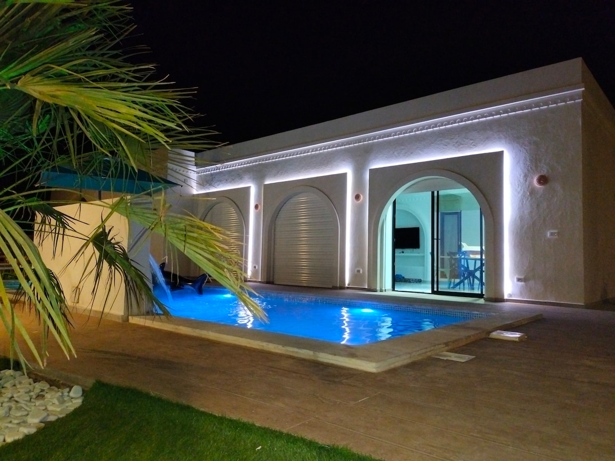 Dobrodošli v svojem počitniškem domu💞✨! Ta udobna hiša je idealna za družine ali prijatelje. Nahaja se v bližini najboljših plaž v Djerbi, zaradi česar je kot nalašč za pustolovščine ob morju. Uživajte v zasebnem bazenu, vrtu z žarom in varnem parkirišču. Hiša ima spalnico z zakonsko posteljo in zasebno kopalnico ter drugo spalnico z zakonsko posteljo in enojno posteljo. Sprostite se v udobni dnevni sobi .!To je popolno bivališče za mirno in nepozabno bivanje✨