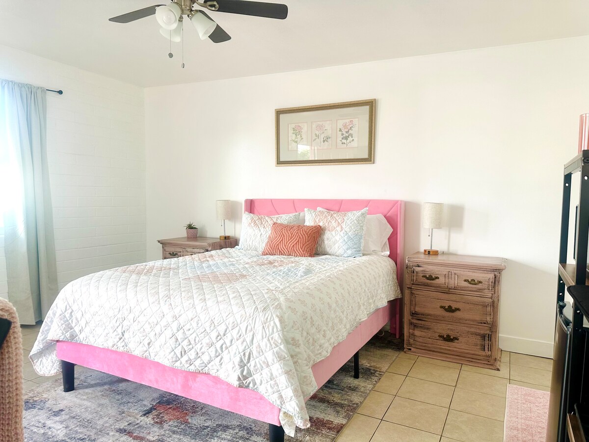 Naša udobna majhna rožnata hiša je bila zgrajena leta 1910 kot kmečka hiša, obdana s polji. Pred nekaj leti smo v celoti preuredili notranjost in posodobili vse, za ogrevanje in hlajenje pa je bila dodana enota s toplotno črpalko. Naš dovoz vodi do zasebnega parkirišča pri zadnjih vratih. Smo objekt za nekadilce in hišne ljubljenčke. Do bolnišnice smo oddaljeni 0,6 milje, nakupovanje je prav tako zelo blizu, srednja šola Safford pa je vidna z naših zadnjih vrat. To je ena spalnica z zakonsko posteljo (Queen).