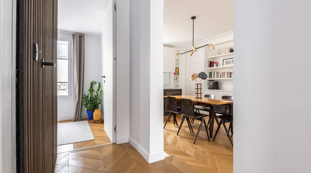 Prefinjeno stanovanje velikosti 110 m2 se ponaša s parketom, lepim pohištvom in obilno naravno svetlobo. Ponuja svetlo, elegantno, toplo in razkošno vzdušje. Stanovanje s kaminom in letvami, ki združuje čar, mir in udobje, se nahaja v enem najstarejših prehodov v zgodovinskem središču Pariza. To stanovanje ima uradno dovoljenje za turistično nastanitev. Zato je popolnoma zakonito.