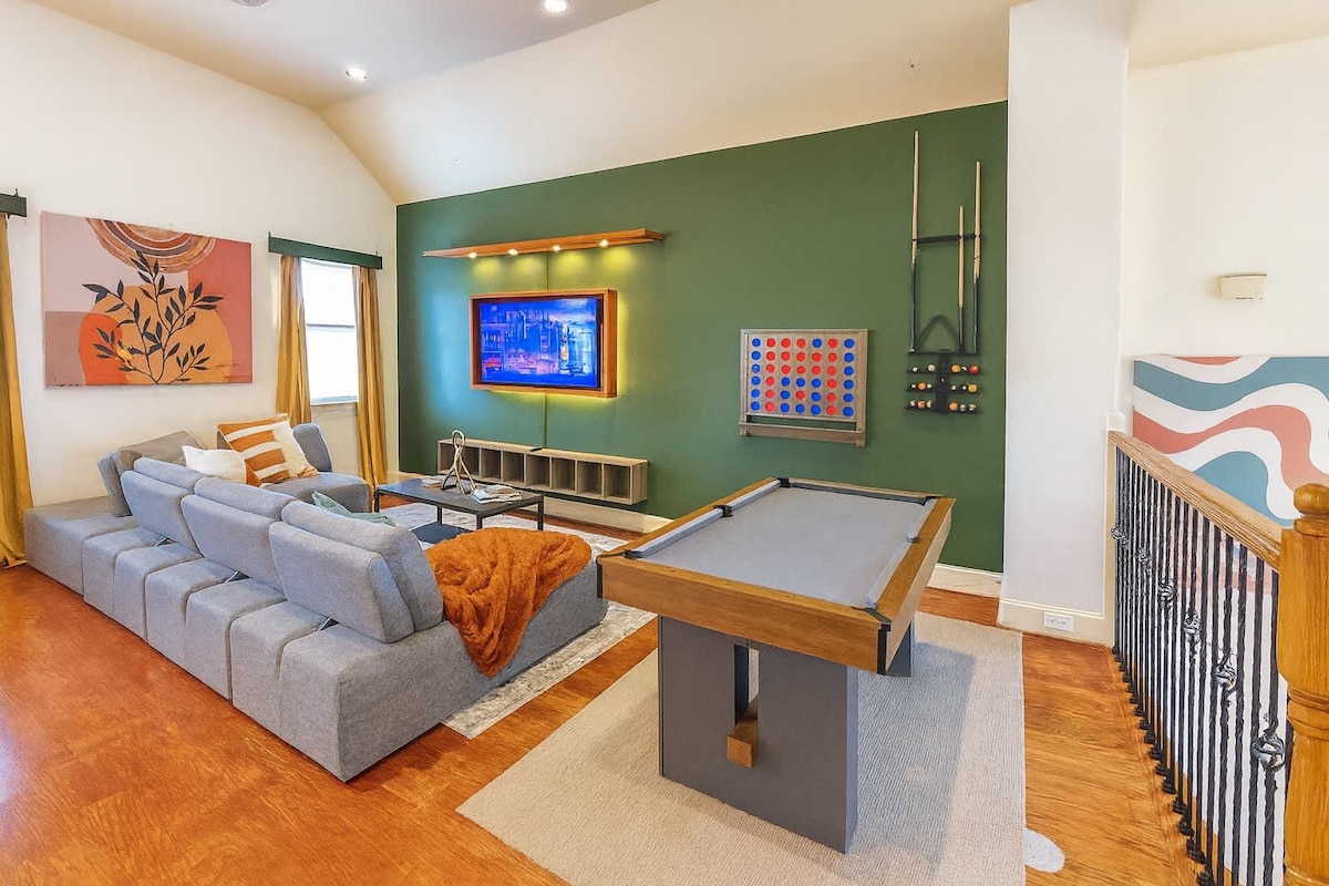 Doživite razkošje v tej vrstni hiši v Houstonu s 3 spalnicami, od katerih ima vsaka zasebno kopalnico/televizijo. Pametni dom ima samodejne ključavnice, luči, sesalnike in termostate. V 2. nadstropju je odprt prostor s kuhinjo, jedilnico in dnevnim prostorom s televizijo Samsung, biljardno mizo, družabnimi igrami in mini barom. V spalnici v spodnjem nadstropju je majhna delovna postaja in pisarniški prostor s polno delovno opremo. Uživajte na dvorišču s sedežno garnituro. Nahaja se manj kot 8 km od stadiona NRG in parka Minute Maid.