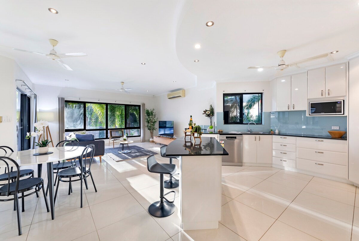Prostorna mestna hiša s 4 spalnicami v mirnem tropskem predelu The Gardens, le nekaj minut od poslovnega središča Darwin, popolna za družine, potovanja s prijatelji in delovne ekipe. V spalnicah lahko spi 9 oseb (glavna spalnica z zakonsko posteljo in kopalnico), na voljo pa so tudi dnevna soba, dnevno ležišče in raztegljiva postelja, tako da lahko skupaj spi do 11 oseb. Zasebno ograjeno dvorišče z masažno kadjo in plinskim žarom, varno avtomatsko zaporo/zaklepanjem parkirišča (plus brezplačno parkiranje na ulici), hitrim Wi-Fi-jem, veliko televizijo in namenskim delovnim prostorom. Hišni ljubljenčki so dobrodošli z odobritvijo. V bližini tržnice Mindil, botaničnega vrta in obale.