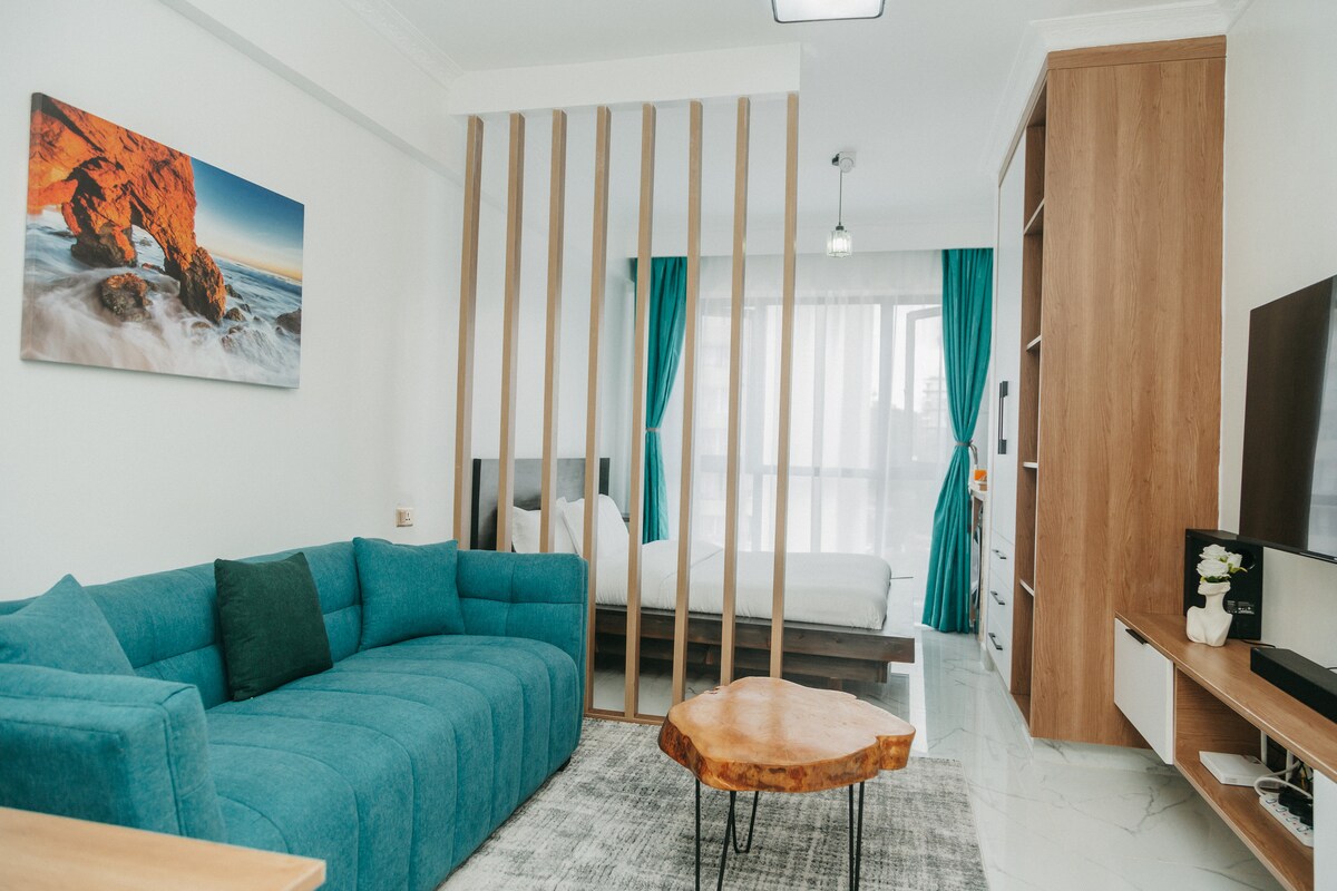 Uživajte v mirni lepoti in priročnosti v tem preprostem mirnem in na novo opremljenem enosobnem stanovanju v 16. nadstropju s čudovitim razgledom na obzorje, v predmestju Riversidea in enostaven dostop do osrednjega poslovnega okrožja, pisarniškega parka in zabavnih mest. Do nakupovalnega središča Riverside Square Mall je 3 minute hoje, do salona Ibury Lounge pa 3 minute vožnje. Stanovanje ima skupno telovadnico in otroško igrišče v sklopu objekta. Resnično je dragulj v zelenem predmestju Nairobija.