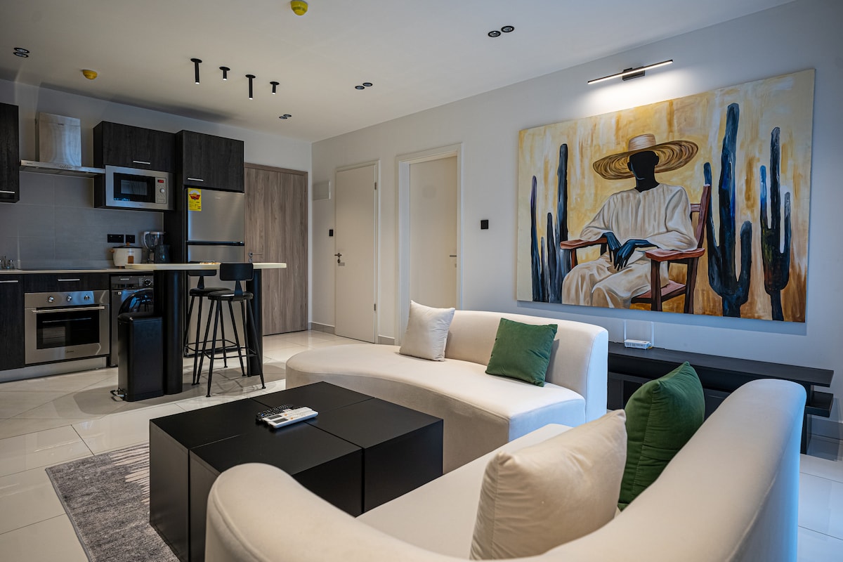 Dobrodošli v razkošnem dvosobnem stanovanju z neverjetno dnevno sobo z odprto kuhinjo in jedilnico. Obe spalnici imata zakonsko posteljo (Queen) in lastne elegantne kopalnice v spalnici. Vsaka soba je zasnovana z plišasto posteljnino, oblikovalskim pohištvom in sodobnimi napeljavami, kar gostom ustvarja razkošen in udoben umik. Sprostite se v tem mirnem in elegantnem prostoru.