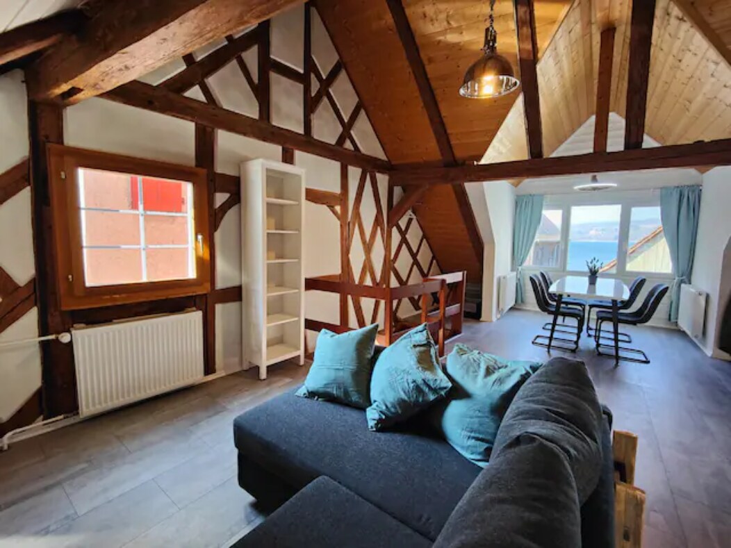 Čudovito, ekskluzivno podstrešje DG (150 m2) z izpostavljenimi tramovi in višino zabat do 4 m v središču mesta Amriswil. Uživajte v bivanju z do 7 osebami v neposredni bližini jezera Constance med Konstancom in Bregenzom.