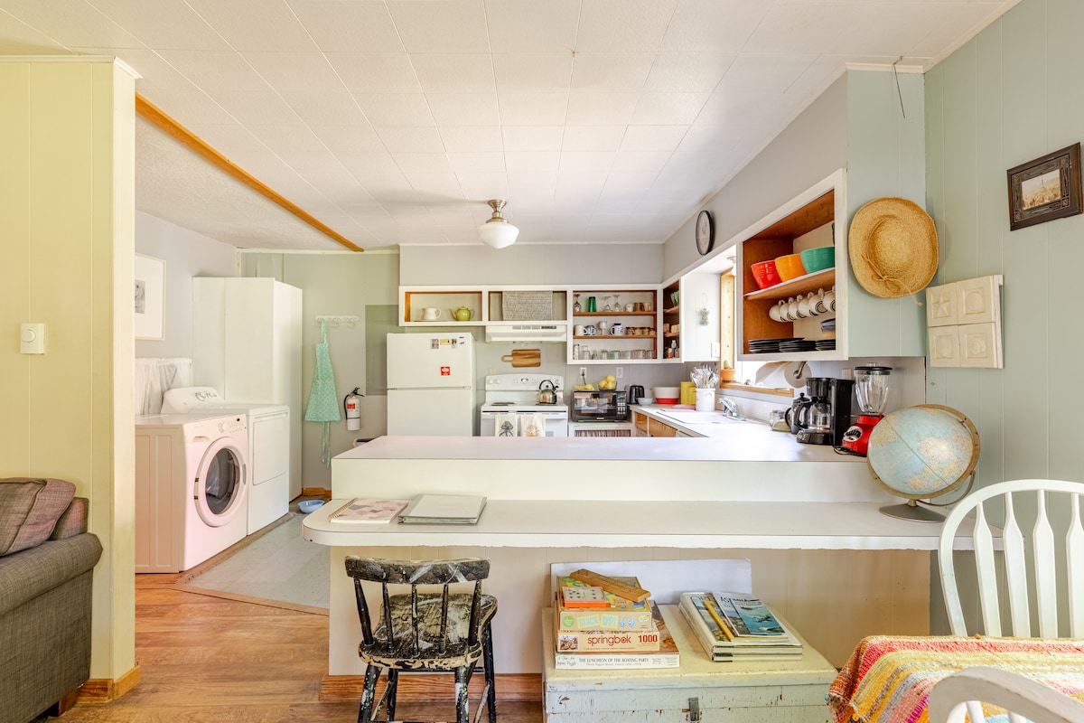 Mirna rustikalna koča z 2 spalnicama (zakonska postelja), 1 kopalnica, kamin na drva, kuhinja popolnoma opremljena, terasa, Wi-Fi,, ROKU TV. 4 ulice hoje do plaže in 2 ulici nakupov/restavracij. Dva parkirišča na zasebnem dovozu, pralni/sušilni stroj, posteljnina, brisače. Hišni ljubljenčki so dobrodošli in sprednje dvorišče sta popolnoma ograjena. Koča ni bila posodobljena. Če iščete naprave iz nerjavnega jekla, jih ne boste našli tukaj, vendar boste našli prostor, ki nam je všeč + polnilnik EV Level 2. Dovoljenje MCA # 1351
