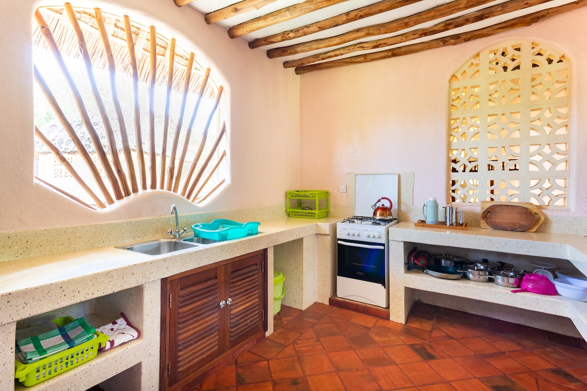 Dobrodošli !Hiša, ohlajena z vetričem, s tradicionalno palmovo streho in bazenom, se nahajata na zavarovanem območju. African Queen - očarljivo okrašena v slogu Suaheli z lastnim bazenom za zasebno uporabo. Le 5 minut hoje do najlepše bele peščene plaže v Keniji. Hiša je v zavarovanem prostoru podnevi in ponoči. Z 2 spalnicama s kopalnico v spalnici in galerijo, vključno z 1 dodatnim ležiščem in 1 dnevno posteljo, bivalnim prostorom in balkonom sta kot nalašč za do 6 gostov.