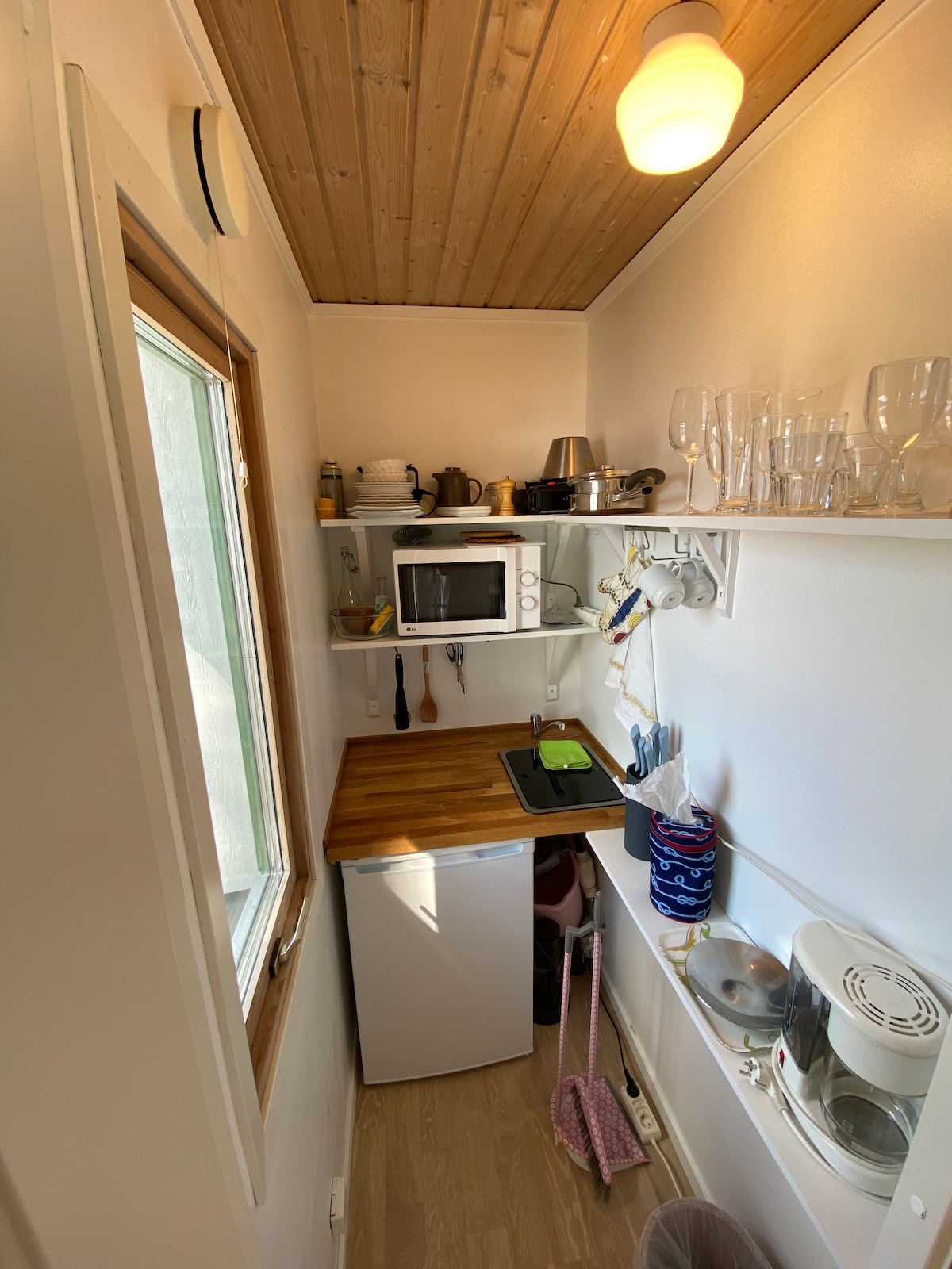 Vårt lilla gästhus i Onsala, ljust och luftigt i en egen del av trädgården. Kort promenad till hav och strand. Två sköna sängar nere och två madrasser på sovloftet. Toalett, microugn, liten kyl, litet utekök, grill, lakan, handdukar och utemöbler på terassen och i porten. Egen dusch via egen ingång i stora huset nära. Hängmatta och oftast två cyklar. Teresa, bildkonstnär, jobbar i ateljén, trädgården eller tar en paus på stranden. Vi trivs med gäster och gör vårt bästa för att alla ska trivas.