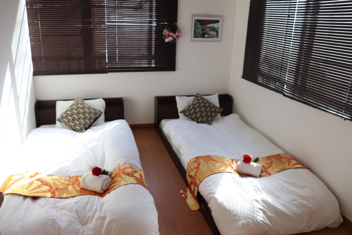 Uživajte v sproščujočem času z družino (do 10 oseb) v prostornem in mirnem prostoru, ki meri ★88 kvadratnih metrov★ Moja hiša je kot nalašč za družine, ki se želijo sprostiti in si ogledati Japonsko za daljše bivanje! Udobno lahko bivate v mirni dnevni sobi 12 tatami in treh spalnicah skupaj s tremi družinami z otroki ter starejšimi otroki in starimi starši. Hiša se nahaja v mirnem stanovanjskem predelu, 13 minut hoje od postaje Urawa. Vožnja s taksijem traja približno 7 minut in prispeli boste za 4 $. Postaja Urawa je na voljo za 4 linije (linija JR Keihin Tohoku, glavna linija JR Tohoku, linija JR Takasaki, linija JR Shonan Shinjuku). To je zelo priročno, ker imate neposreden dostop do glavnih mest. (Ueno 21 minut, Ikebukuro 19 minut, Tokio 26 minut, Shinjuku 25 minut, Shibuya 31 minut) Od postaje Urawa potrebujete 7 minut neposredno do postaje Omiya.Shinkansen se lahko uporablja na postaji Omiya, zaradi česar je primeren za oglede v različnih delih vzhodne Japonske. Območje okoli postaje Urawa je čudovito in prefinjeno mesto.Obstaja veliko restavracij in priročnih trgovin. Moja hiša ima 3 zasebne spalnice in 2 stranišči, popolna je za družine za daljše bivanje, popolna za ogled znamenitosti v Tokiu, tranzitne točke za izlete na Japonsko in delovne počitnice. Upam, da boste imeli sproščujoče in udobno bivanje na Japonskem s svojo družino v tej hiši!