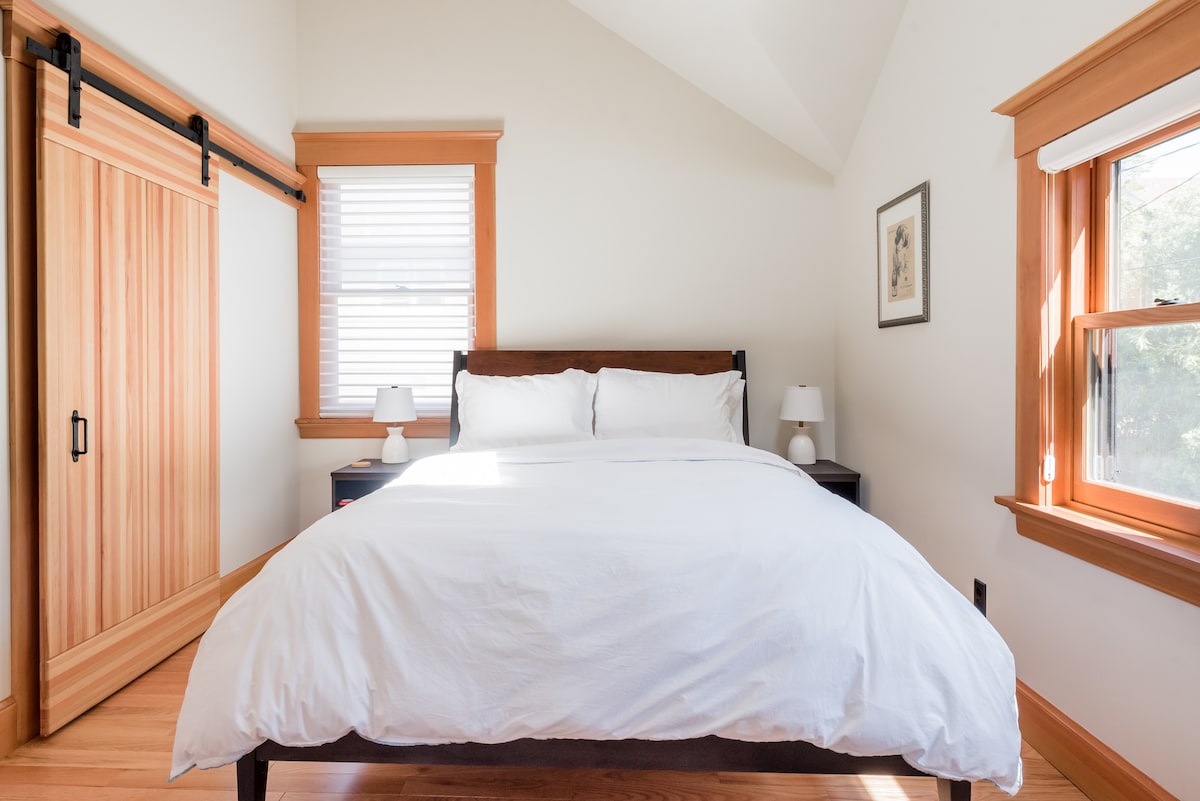 Nahajamo se v mirni stranski ulici – tik za vogalom dinamične restavracije v Kernsu, 5. najbolj kul soseski na svetu. Sprehodite se po parkih, živi glasbi, vintage trgovinah in starinskem kinu. Sprehodite se, Lyft/Uber, kolesarite ali uporabljajte neverjeten javni prevoz v Portlandu povsod. Visoka okna gledajo na zelenje in udobno verando. Hiša naše družine iz leta 1900 je bila razdeljena na ločena stanovanja. Je kot umetniška hotelska soba, vendar veliko bolj domača.
