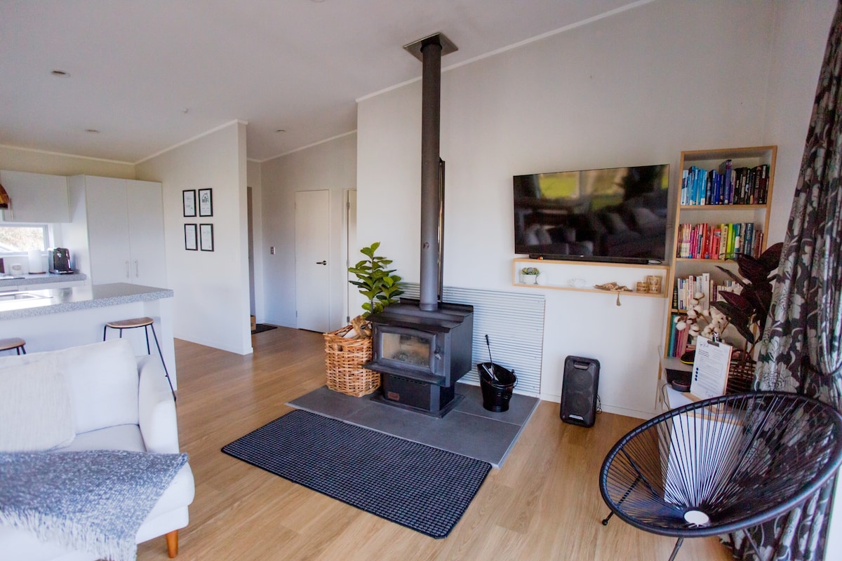 Naša okolju prijazna hiša s 3 spalnicami (zgrajena leta 2013) se nahaja na 10 zasebnih hektarjih regeneracijskega domačega grma, le 7 minut od vasi Waimarino/National Park Village. Idealno za križišče Tongariro, smučanje, gorsko kolesarjenje ali hojo po grmovju. Uživajte v udobnem bivanju s sončno teraso, vulkanskim razgledom na gore, ognjem, sončno energijo (z rezervno mrežo) in okni z dvojno zasteklitvijo. Sprostite se v zunanji kopeli na drva s popolno zasebnostjo in pogledom na grmovje, jelene in zvezde.