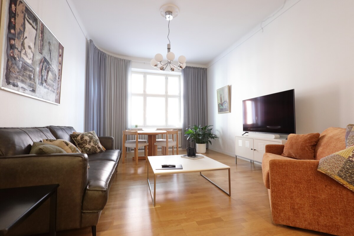 Dobrodošli v svojem domu v Helsinkih! Stanovanje se nahaja v Töölöju, ki je prijetna soseska z odlično kavarno. Avtobusne in tramvajske postaje so tik ob stavbi (Kamppi je 10 minut stran, glavna železniška postaja 15 minut vožnje z avtobusom). Olimpijski stadion in objekti na kratki razdalji (trgovine, knjižnica, restavracije). Stanovanje je zelo udobno s sodobno opremo - našli boste vse, kar potrebujete za odlično bivanje s popolnoma opremljeno kuhinjo in udobno posteljo. Veselimo se, da vas bomo sprejeli.