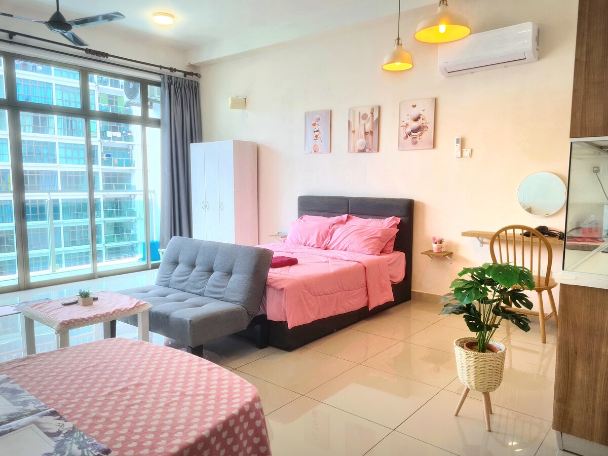 This is a spacious 2Bedroom unit perfectly fit for guests up to 5 pax with total of 1 king size bed 1 queen size bed 1 single bed High floor with high view. 1. Basketball Court 1. Gym Room 2. Function Hall 3. Lounge 4. Library 5. Manicure Shop 6. Mini Theatre 7. BBQ Deck 8. Swimming Pool 9. Sauna 10. Jacuzzi 11. Game room (Pool Table, PS Room, Darts and more) 12. Laundry 13. Mini Market -Sky Garden Guest are not allow to smoke in the room , please smoke at the balcony if needed
