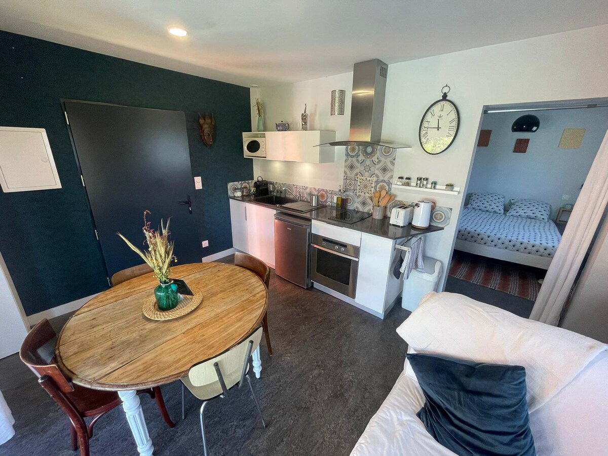Idéalement situé à la campagne à Bas-Mauco dans les Landes, à moins de 5 minutes de Saint-Sever, et 15 minutes de Mont-de-Marsan. Agréable studio de 25m² entièrement aménagé avec goût, attenant à notre propriété, avec entrée séparée et privative, composé de : - Cuisine équipée (frigo, micro onde, cafetière, plaque de cuisson, ustensiles) - Chambre avec lit de 160x200 - Salle d'eau - WC séparé - TV connectée et WIFI - Petit espace extérieur privatif. Le linge de maison est fourni.