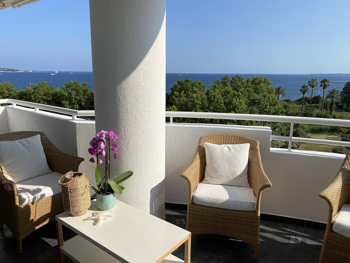 "ANTIBES LES PINS RESIDENCE" -2 BR WITH 3 TERRACES-SEA FRONT-LAST FLOOR-EXPO EAST/SOUTH/WEST... Sea facing Apartment located on the top floor of a luxury residence just above the EXFLORA Park. Direct access to the beach (100 m)-No road to cross. Secure infinity pool with waterfall+solarium as well as a paddling pool & sanitary area: Open all year round and supervised in July+August. Reduced-mobility access (access to basement, apartment, swimming pool and beach).