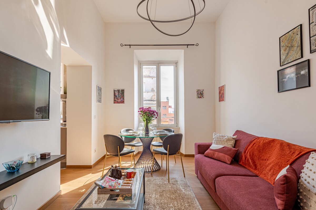 Appartamento elegante e luminoso di 70 mq, recentemente ristrutturato , arredato con mobili su misura. Situato in un palazzo silenzioso nel cuore di Trastevere, unisce comfort moderni e charme romano. Dispone di una camera da letto matrimoniale con letto king-size 180x200 cm, un ampio soggiorno con divano letto e TV, cucina moderna attrezzata, studio per smart working, bagno con doccia e pratici armadi.