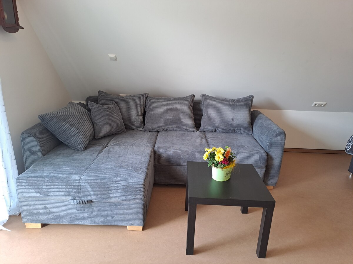 Naš 65 kvadratnih metrov velik maisonette je bil v celoti prenovljen leta 2017. Sodobno, popolnoma opremljeno 3-sobno stanovanje lahko sprejme 4 osebe in je kot nalašč za družine in poslovne potnike. Stanovanje vključuje sončno teraso in parkirno mesto. Baker, mesar in avtobusna postaja so oddaljeni manj kot 100 m. Do središča mesta so štiri postaje. DTV je podelil naše stanovanje s 4 zvezdicami (* * * *F). Toplo vas sprejmemo. Karin in Thomas