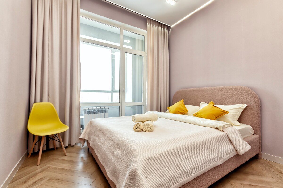 Elegantno in udobno enosobno stanovanje v osrčju Astane. Uživajte v sodobnem dizajnu, popolnoma opremljeni kuhinji, udobni zakonski postelji, hitrem Wi-Fi-ju in pametnem televizorju. Nahaja se v bližini glavnih znamenitosti, restavracij in javnega prevoza. Idealno za poslovna bivanja in bivanja v prostem času. Samostojni vstop, čist, varen in pripravljen, da vas sprejme.
