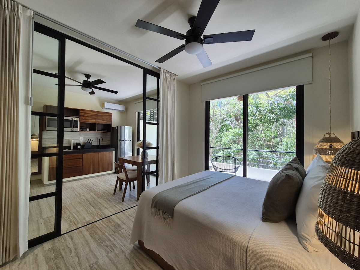 Pobegnite v naše mirno enosobno stanovanje v bujnem srcu Tuluma. Uživajte v sodobnem udobju s popolnoma opremljeno kuhinjo, udobno zakonsko posteljo (Queen), raztegljivim kavčem in zasebno teraso, obdano z zelenjem. Odlična lokacija v bližini najboljših restavracij in trgovin ter le kratka vožnja do neokrnjenih plaž v Tulumu. Idealno za pare, samostojne popotnike ali poslovna potovanja. Wi-Fi, klimatska naprava in parkirišče.
