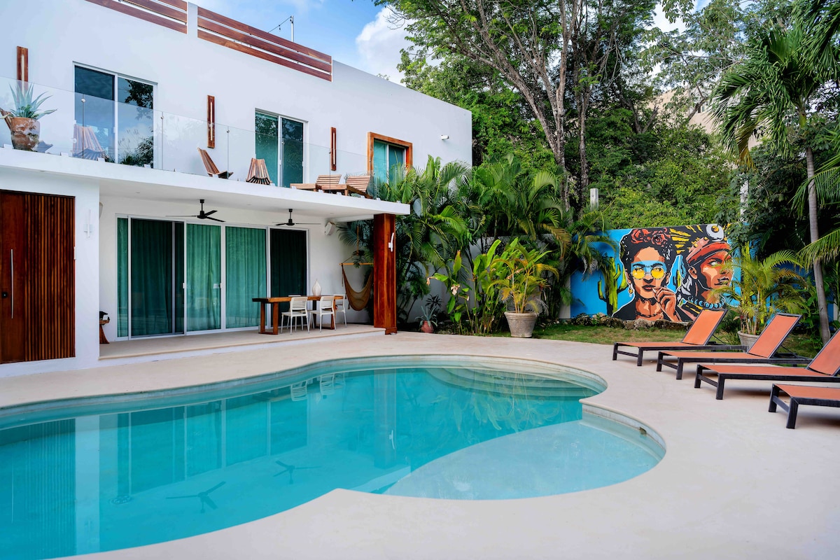 Best Location in Popular La Veleta! Right near trendy Calle 7 Sur. Walk to amazing restaurants, cafés and shops. Great for wedding parties! Totally private and safe villa with gorgeous palms and jungle landscaped gardens. A stunning pool with a fountain to relax by. This villa has unique architecture with designer decor that showcases original local artwork. It is exclusive to one booking. Designed as 2 separate condos, an upper and lower, with a total of 4 bedrooms with private ensuite baths.