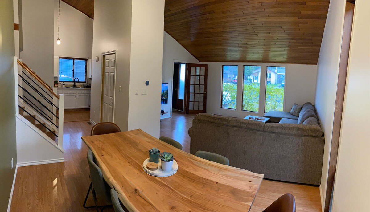 The Raven 's Roost is a Family & PET FRIENDLY upper level of a home, nestled in a quiet neighborhood backing on natural forest park & playground. Do središča mesta nas loči pet minut hoje. S tremi spalnicami, štirimi visokokakovostnimi posteljami, lepim odprtim dvoriščem z ognjiščem in teraso, kjer se lahko sprostite, je to odličen kraj za sprostitev po velikem dnevu raziskovanja geoparka. Kopalnica ima globoko kad in lokalno milo, naša kuhinja pa je dobro založena za tiste, ki radi kuhajo. Dobrodošli!