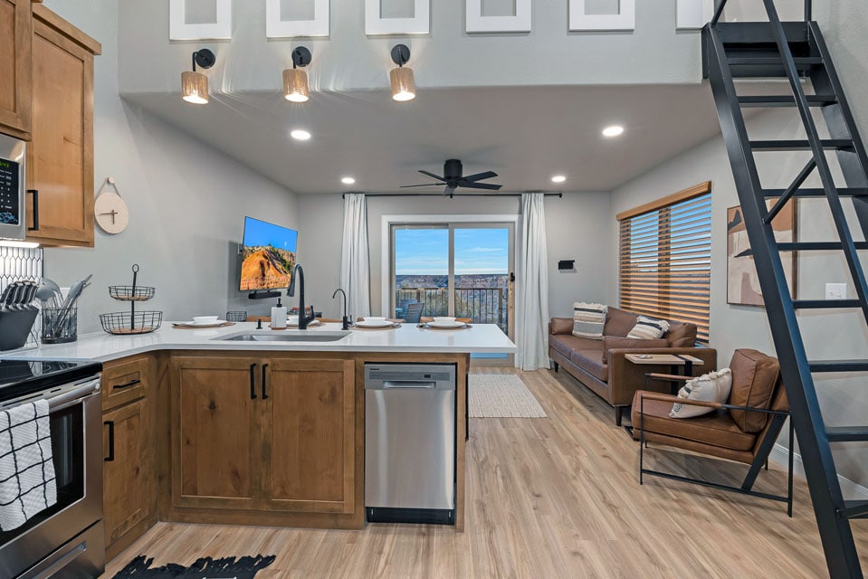 Rustic Highland is a 740 sqft tiny luxury cabin full of warmth and charm, featuring stained cabinetry and boho-inspired accents. The bright living area flows into a fully equipped kitchen, and the spa-like bathroom adds a touch of luxury. The main bedroom has a queen-size bed with ample storage, while the loft offers another queen bed and stunning canyon views. Outside, enjoy the private patio with a bistro table and grill, all set on the edge of Palo Duro Canyon for an unforgettable experience.