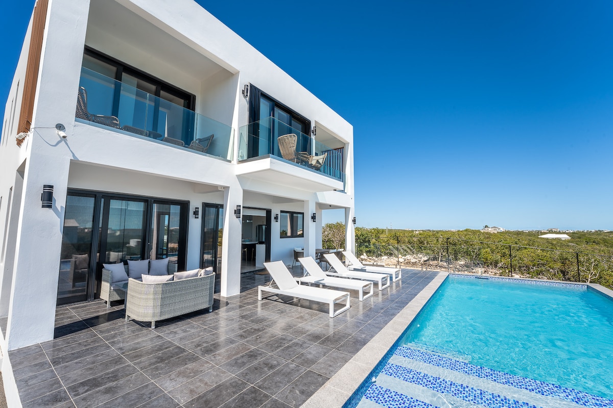 ➤ Pobegnite v svojo zasebno oazo v tej osupljivi, sodobni 4-sobni vili s pogledom na ocean iz skoraj vsake sobe! ➤ Lahko se konfigurira tudi 3-bdrms w/office ➤ 7 minut hoje do plaže Long Bay Beach, 7 minut vožnje do plaže Grace Bay in lokalnega supermarketa. ★ Luksuzna vila z zasebnim bazenom ★ Popolnoma založena sodobna kuhinja: vrhunski gospodinjski aparati z vsem udobjem doma. ★ Oprema: stoli za plažo, senčniki, brisače, hladilniki itd. ★ Zasebna kopalnica in terasa v spalnici ★ 65-palčnipametni LED-televizor