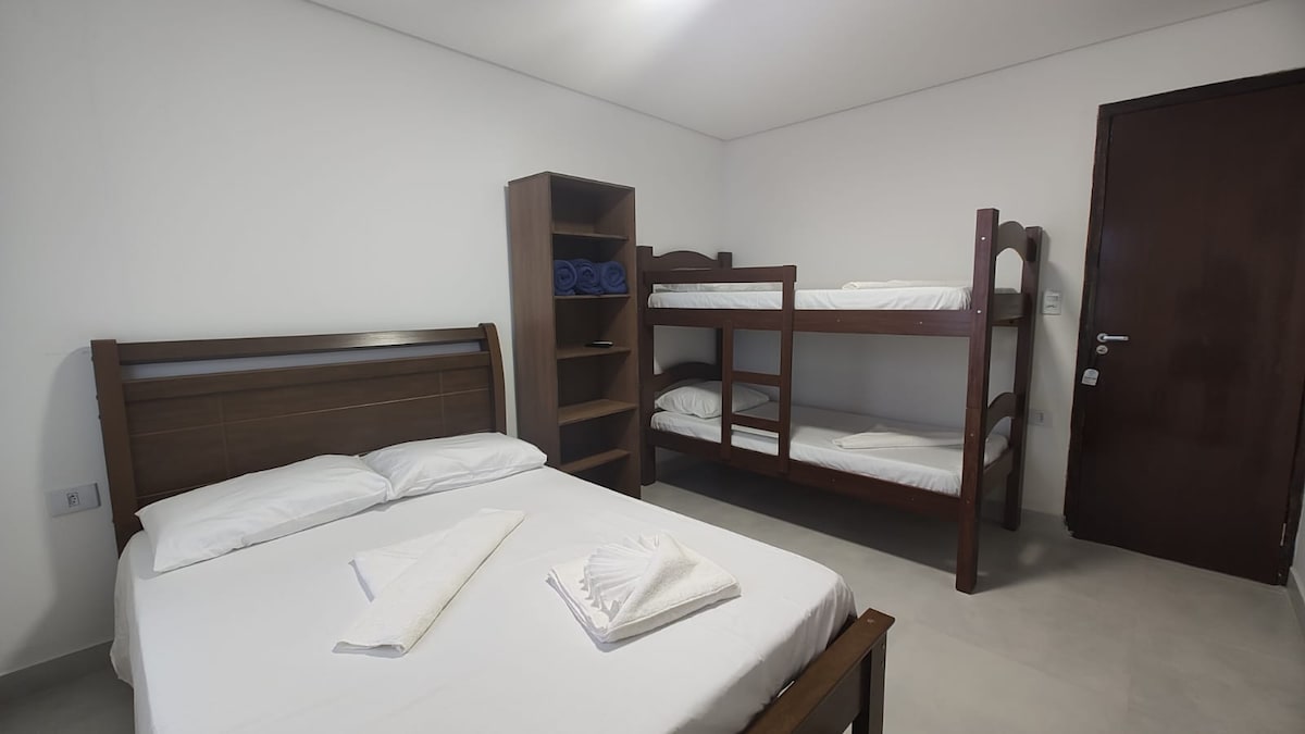 Quarto tipo suíte, com uma cama de casal e duas beliches (4 camas de solteiro), TV, Wi-Fi, ventilador turbo, geladeira e banheiro privativo dentro do quarto, a 350 metros do mar.