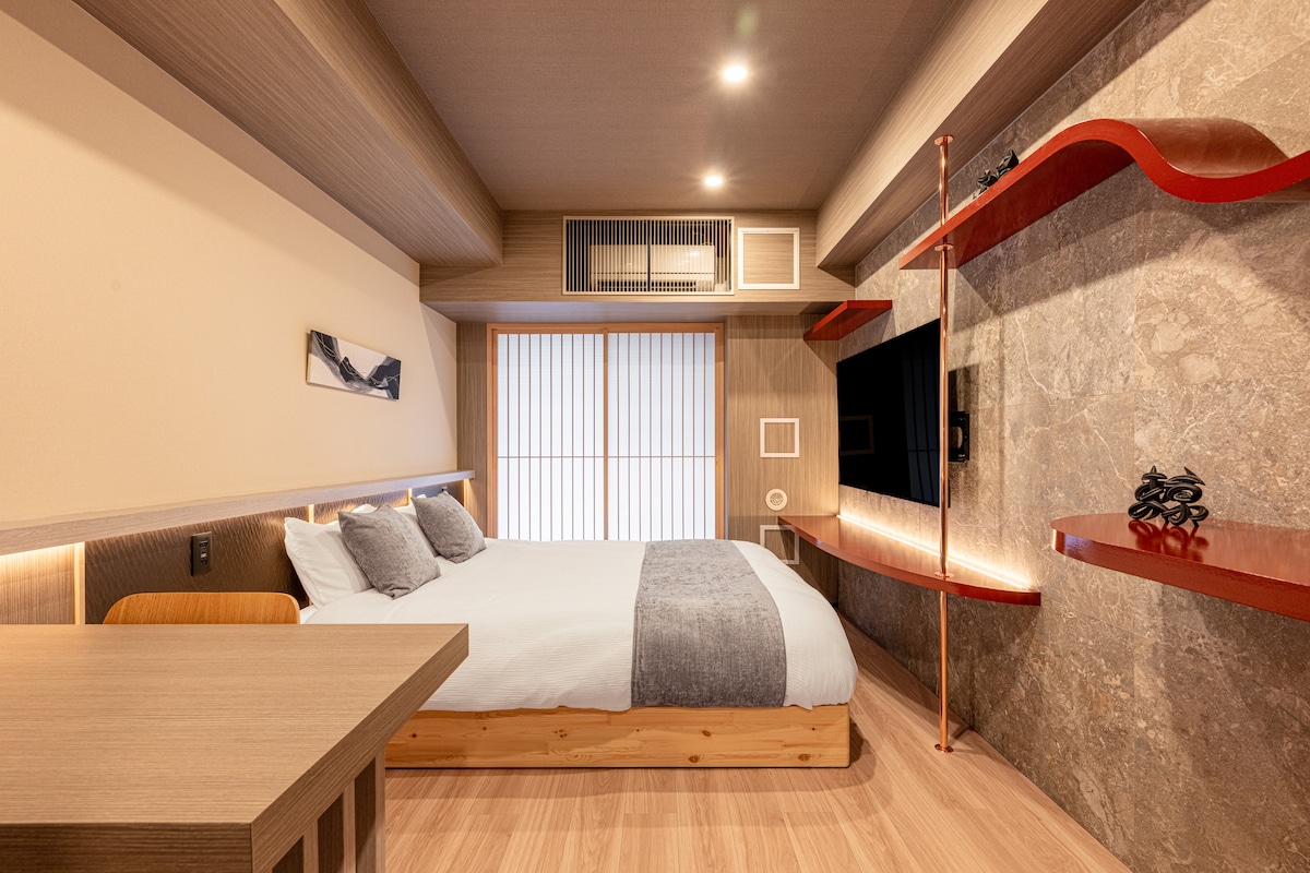 Located near Akihabara and Okachimachi with easy access to several train lines, this cozy wood-themed studio offers a calm and modern stay. The 25㎡ room includes a queen bed, desk, 55-inch TV, and printer. The kitchen has a gas stove, microwave, toaster, BALMUDA kettle, rice cooker, and cookware. A shower room, separate toilet, washing machine, and amenities are provided. Soft lighting and natural wood create a relaxing space ideal for both business and leisure.
