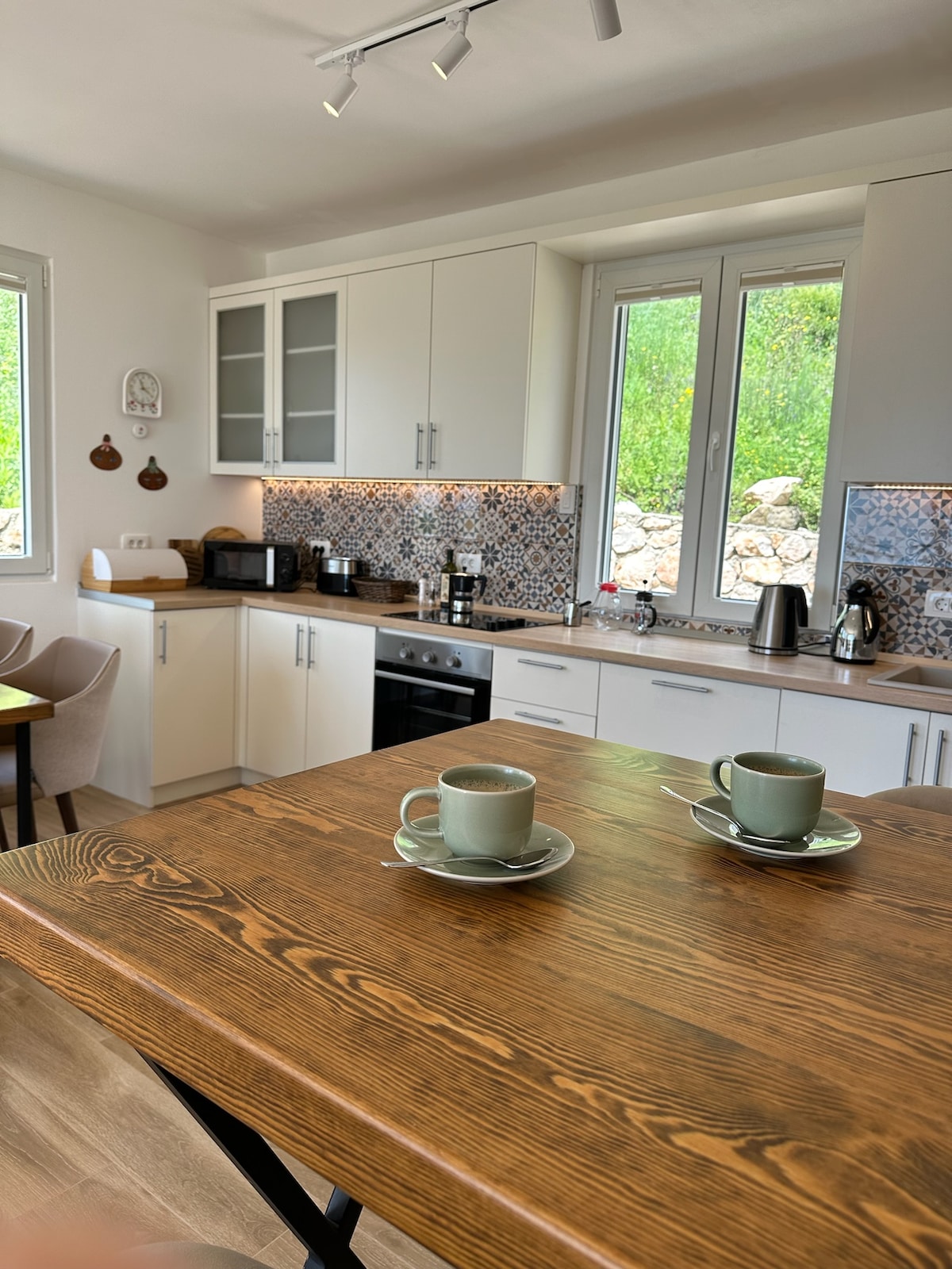 Lehne dich zurück in dieser ruhigen, stilvollen Unterkunft. Geniesse eine traumhafte Aussicht auf die albanischen Berge, Čas See und Adria. Pool.Neues, voll ausgestattetes 74qm Ferienhaus (max. 5 Pers.). Einladende große, offene Küche mit Bar und gemütlichem, hellen Wohnzimmer. Große Terrasse. 2 Schlafzimmer, Flurgarderobe. Technische Geräte: Voll ausgestattet mit allen Küchengeräten, Waschmaschine, Moderne Klimaanlagen in allen Zimmern, Bad mit Fussbodenheizung.