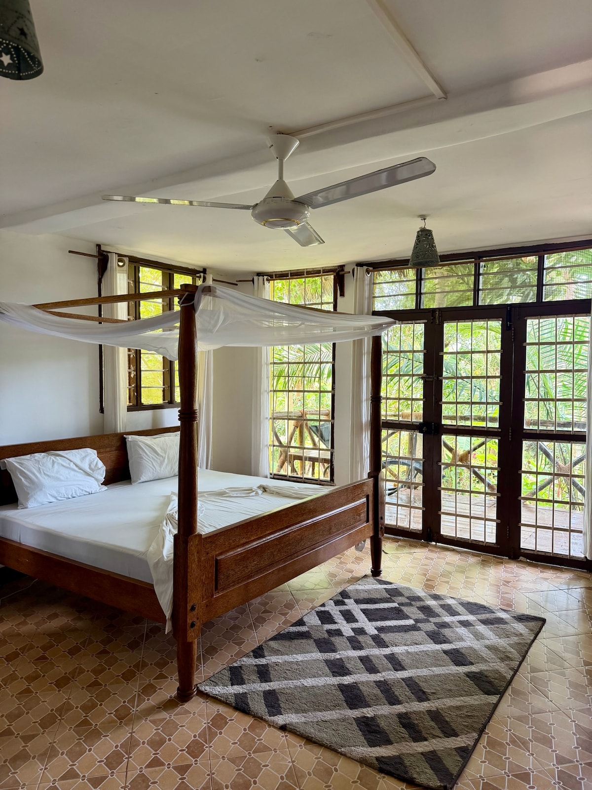 Soba s pogledom na ocean in zasebnim balkonom. 1 zakonska postelja, 1 enojna postelja in zasebna kopalnica s prho v 2. nadstropju. V celoti prenovljeno decembra 2024. Zbudite se na severozahodni obali Zanzibarja ob valovih oceana, zvokih narave in vroči skodelici kave. Od oceana do ustja s svežimi lignji, ribami in raki, kajakom do otoka, opazujte sončne zahode, vzpone lune, zvečer v kresu. Lazy viseča mreža, Wi-Fi in rustikalno razkošno življenje, 6 zvezdic svahili obroki, lokalni pohodništvo, kajak.