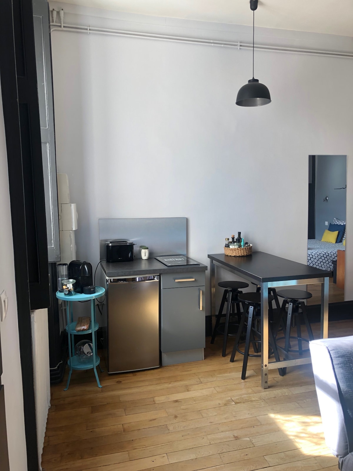 11m² courtyard-facing studio in the heart of the peninsula, less than 10 minutes from Perrache train station, near the Ampère metro station and the T1 tram line on Rue de l'Université. Kitchen with microwave, refrigerator, stovetop, and coffee maker. My apartment is adjacent to the studio, which is completely independent except for the shared entrance hall. Check-in is independent. Keys are collected from a store located 800m away. Check-in hours are extended (7 a.m. to 10pm).