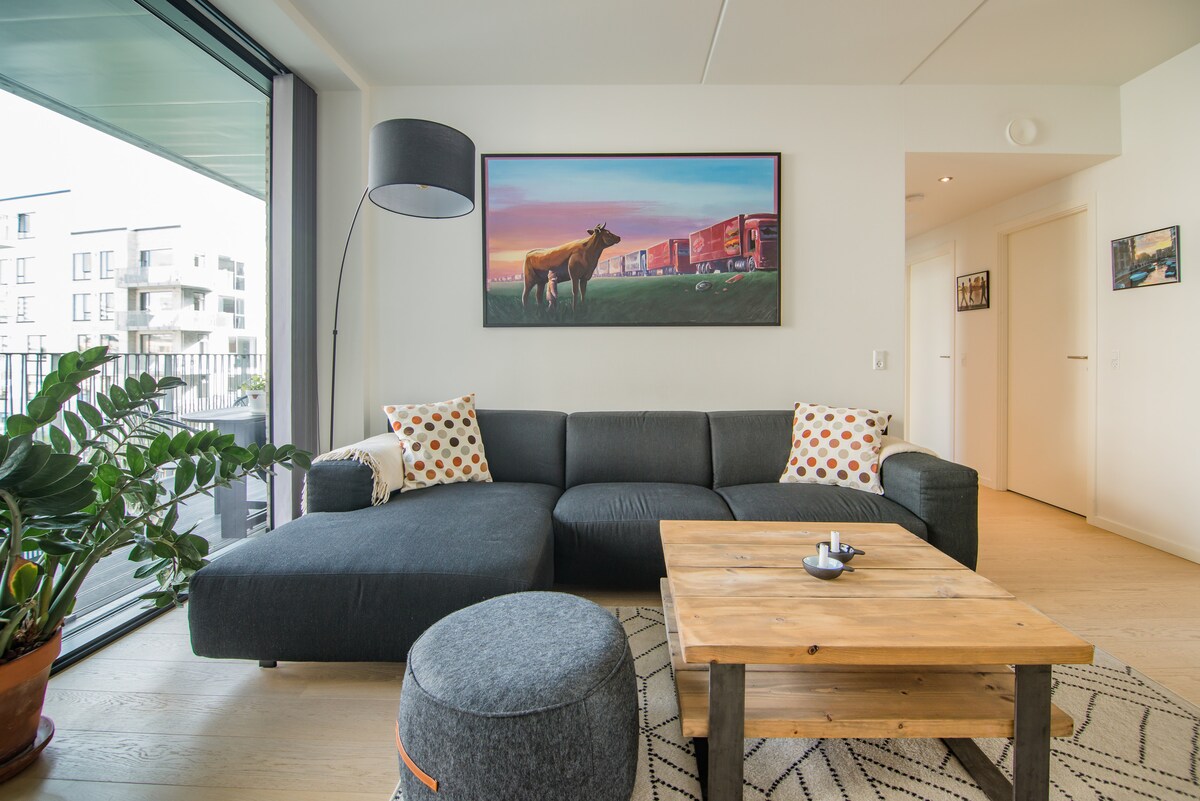 Lepo, luksuzno stanovanje v Københavnu, s pogledom na morje. Uživajte v kosilu in večerji na soncu, na prijetnem balkonu. Skuhajte si jo sami ali naročite v kakšni od bližnjih kavarn. København center je 8 minut vožnje z avtomobilom, ali pa lahko jadrate na avtobusnem trajektu, ki je le nekaj minut stran. Lepo igrišče za otroke, tik pred vrati. Sporoči mi, če potrebuješ otroško potovalno posteljo, jaz pa jo bom dal na voljo.