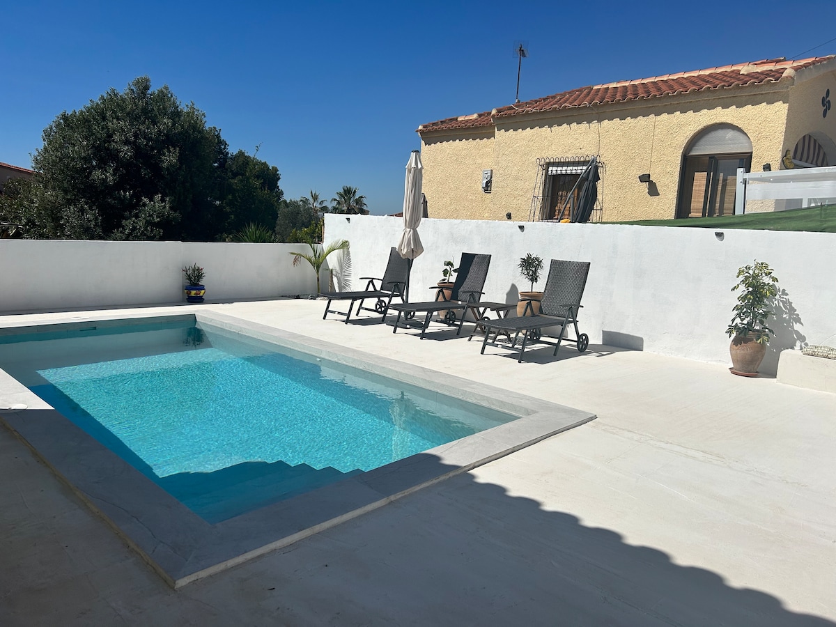 Fantastična vila 70 m razporejena v dnevni sobi in jedilnici, neodvisni kuhinji, 2 spalnici, 1 postelja 150 cm in 2 postelji 90 cm, 1 kopalnica in velika parcela več kot 200 m, v kateri lahko uživate v zasebnem bazenu, prostoru za žar in več prenočiščih na prostem. 3 minute hoje do nakupovalnega območja s supermarketom, bari, restavracijami in 4 kilometri od plaže Pinet, ki je praktično virg. Naj bodo vaše počitnice nepozabne v tej razkošni sredozemski vili.