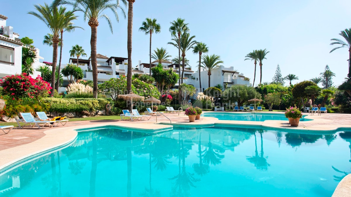 Apartamento ideal para familias en zona residencial con 7 piscinas, pista de tenis, pádel, gym, parque de niños, restaurante y seguridad 24 horas. La urbanización se encuentra en primera linea de playa y con acceso al paseo marítimo adonde se puede andar hasta Estepona. El apartamento tiene 2 dormitorios, 2 baños, salón- comedor con acceso a la terraza con bonitas vistas al jardín, piscina y el mar. Un sitio perfecto para vacaciones.
