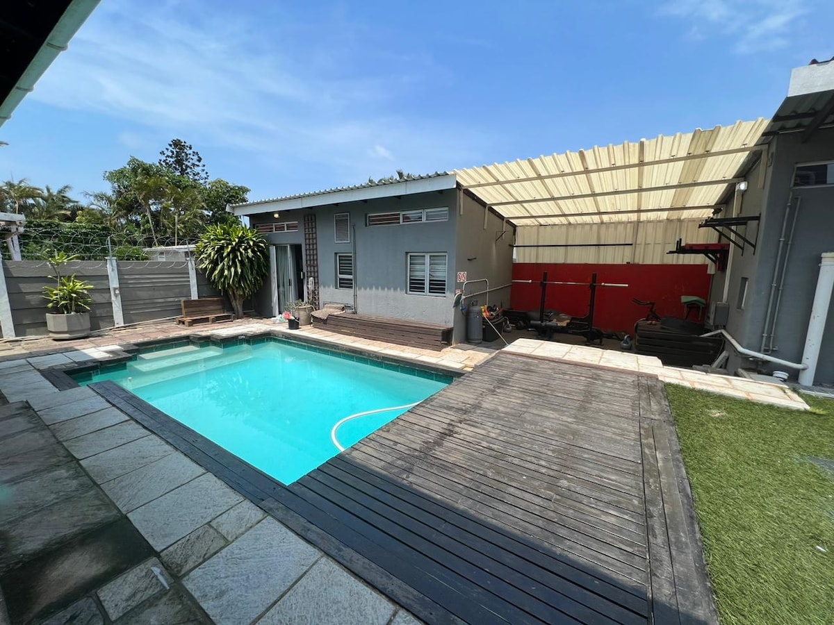 Sprostite se z vso družino v tem mirnem prenočišču. Družine vabimo, da pridejo in bivajo v našem dvosobnem stanovanju, 10 minut stran od letališča King Shaka. Imamo čudovito teraso, plinski Braai, zunanji salon, skupni bazen s pogledom na ocean. 5 minut vožnje od plaže. Osrednji del med Umdlotijem in Umhlango. 2 minuti vožnje od igralnice Sibaya. Dama v bližini. Dovoljena sta 2 odrasla in 2 otroka, potrebna je predhodna odobritev za 4 odrasle osebe. Tiha ulica. Zabave, glasna glasba ali obiskovalci niso dovoljeni
