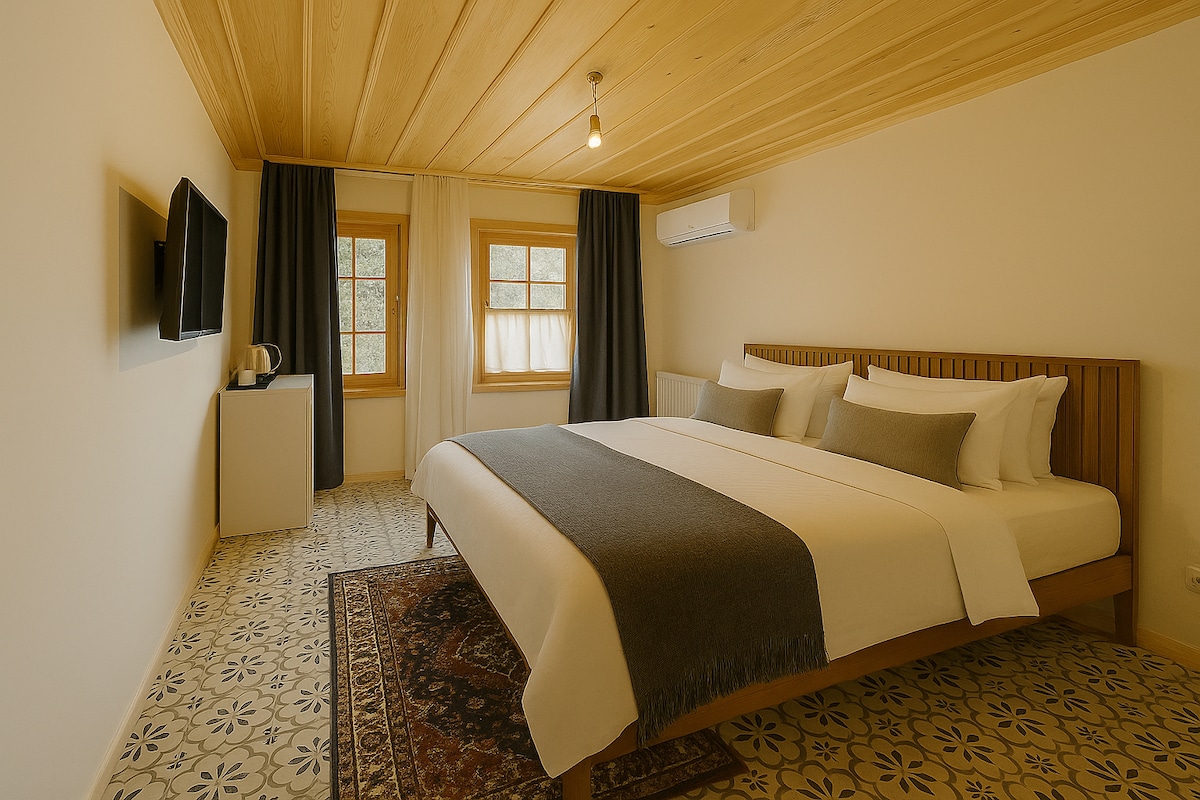 Naša soba je razkošna, sodobna in skrbno oblikovana. Ta soba se nahaja v našem hotelu in ima veliko zakonsko posteljo, 32-palčno pametno televizijo in zasebno kopalnico. Naša soba ima mini hladilnik in majhne kuhinjske potrebščine. Naša soba je v 2. nadstropju. Na voljo sta non stop kamera in varnostni sistem. Zunanja vrata stavbe so posebej kodirana in zaščitena. Naša soba je zasnovana tako, da sprejme 2 osebi.