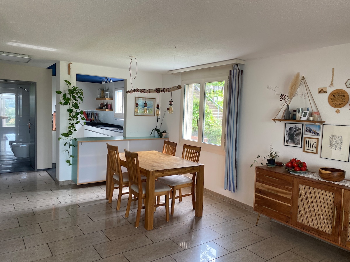 Discover the best of nature near Zurich! This large (>200m2) house offers tranquility just 30 mins from central Zurich by public transport (20 mins by car). Enjoy a well-equipped kitchen, high-end bathrooms, cozy living room, and a wintergarten with BBQ and pool table. Sleeps up to 9. Explore the garden with an unobstructed view of the Alps. Bicycles provided! Escape to our nature retreat, where city convenience meets serene beauty. Book now and enjoy our home while we are in away.