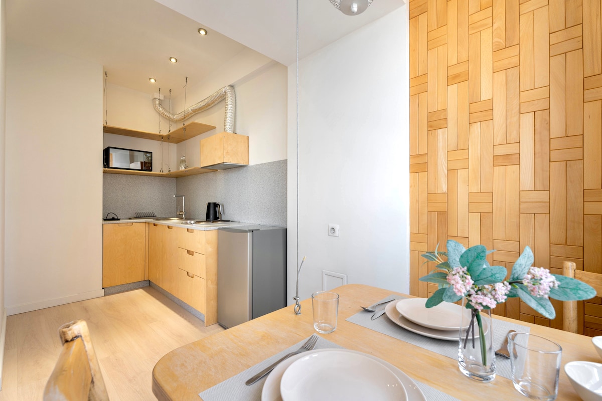 Uživajte v udobnem bivanju v garsonjeri. S površino 30 m2 nudi dovolj prostora za vaše bivanje. Hitro omrežje WLAN,klimatska naprava je vključena. V celoti opremljena z vsemi potrebnimi napravami. Udobna postelja širine 1,65m, idealna za eno osebo in primerna za majhno družino. Nova stavba z dvigalom in varovanim dvoriščem. Stanovanje se nahaja na odlični lokaciji, le 15-20 minut vožnje s taksijem od središča mesta. V neposredni bližini boste našli:supermarkete, suši bar, picerijo,restavracije z nacionalno kuhinjo, trgovine z alkoholom.