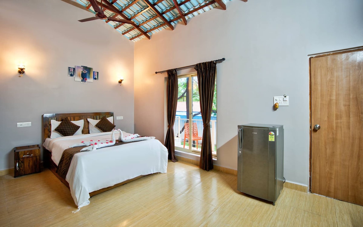 Warm, spacious & classy fully-furnished luxury ultra-spacious room in the very heart of Morjim! Bed room is large & have private attached bathrooms & you have ample space in the room for chillingout. The famous Morjim Beach gets you fantastic view of beach which is walkable from hotel.