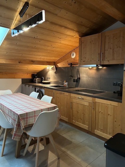 Incredible cocoon in the heart of Chamonix! L'Abri Vallot will seduce you with its location and decoration in a contemporary mountain style! Enjoy a private terrace with a sofa and a view of the glaciers and Mont-Blanc summit! A separate bedroom with a very comfortable double bed (separable into two single beds), a kitchen equipped with all the appliances! The walk-in shower to start a great day!
