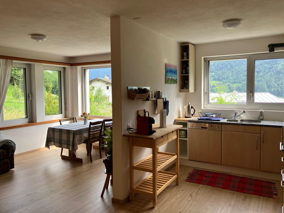 Preživite sproščujoče počitnice v središču Poschiava. Naše majhno, vendar udobno stanovanje vam nudi vse udobje in to le nekaj korakov od trga. Sodobna kuhinja in odprt dnevni prostor vas vabita, da se zadržujete in uživate v čudovitem vremenu zunaj pod paviljonom ali na žaru. Igrišče je lahko v ospredju. Ker živimo z našimi 4 otroki in psi v zgornjem nadstropju, je vedno nekdo tam, če kaj potrebujete.