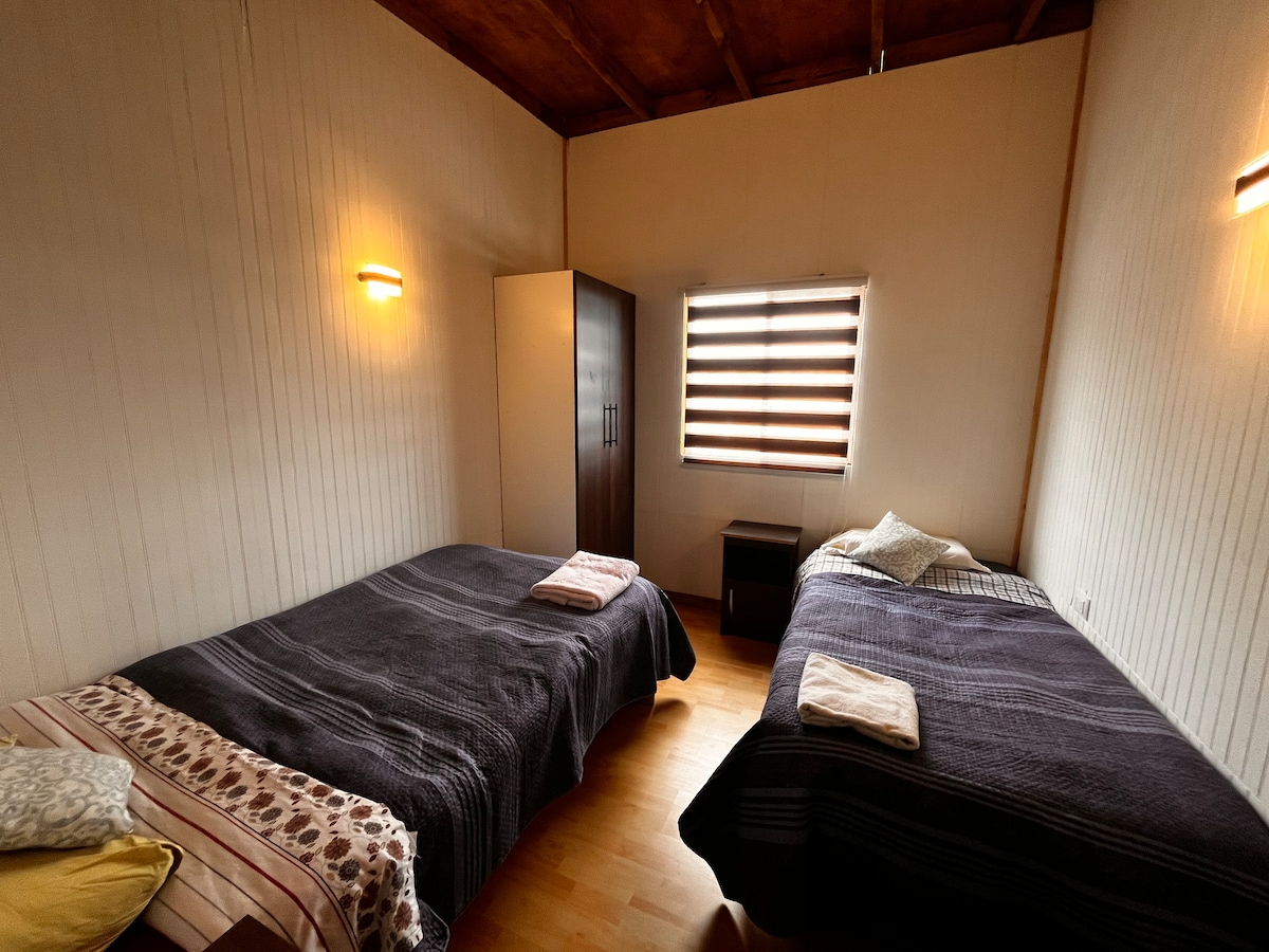 Udobna koča za 4 osebe z brezplačnim parkiranjem na vratih. Skupna terasa s cvetjem, rastlinami in otroškimi igrami. Varno, gostoljubno in gostoljubno bivališče. Vključuje 2 spalnici (zakonska postelja + 2 enojni postelji), popolnoma opremljeno kuhinjo, zasebno kopalnico, pralni in sušilni stroj, sušilnik za lase in brezplačen WI-FI. Nahaja se 20 minut od Pichoya, 3 minute od INACAP, 10 minut od središča mesta, 10 minut od UACha (prek mostu Cau-Cau). Kajenje ni dovoljeno. Hišni ljubljenčki niso dovoljeni...