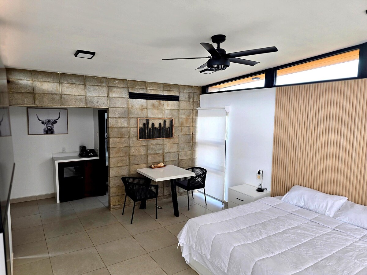 Prostor je zasnovan za prijeten počitek in uživanje v sončnih vzhodih, sončnih zahodih, nebu, zvezdah in luni z vaše terase. Primerno za dve osebi, z zakonsko posteljo (Queen), klimatsko napravo, ventilatorjem, aparatom za kavo, toplo vodo in hitrim satelitskim internetom. Obsežna stena za zasebnost in varnost. Kopalnica ima ogledalo, milo, šampon, balzam, brisačo za roke in sušilnik za lase. Uživajte v vinogradih in vinskih kleteh v Valle de Guadalupe. Varno in blizu najbolj znamenitih krajev v regiji.