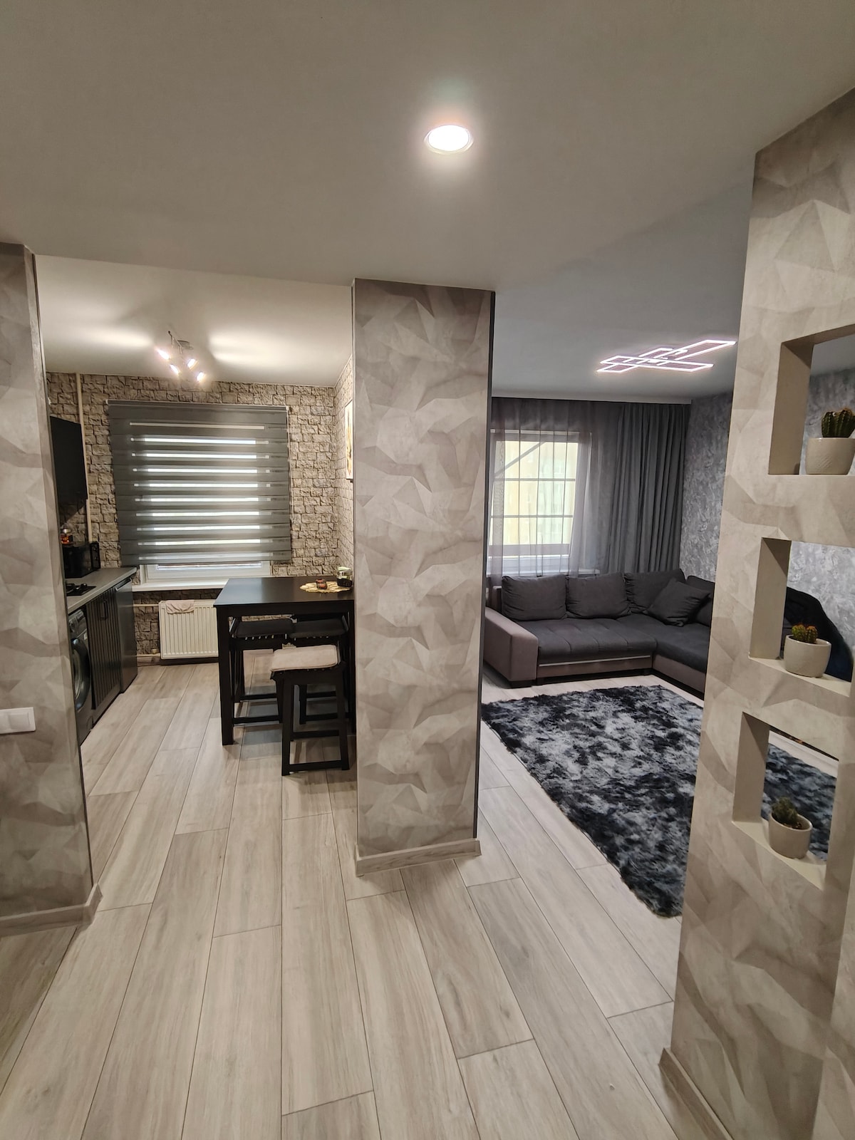 Uživajte v elegantnem doživetju v tem bivališču, ki se nahaja v središču mesta. Trosobno stanovanje lahko prosto sprejme do 6 oseb (4+2). S popolnoma opremljeno kuhinjo za prijetna jutra, čudovito belo oblikovano spalnico z zakonsko posteljo, kopalnico s prho in kadjo z disko kroglo, določenim delovnim prostorom. Vse to je na voljo v osrčju Valmiere, le nekaj korakov stran od kina in manj kot 1 km stran od sveže prenovljenega dramskega gledališča Valmiera.