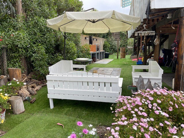 "Relájate con toda la familia en este apacible refugio rodeado de naturaleza, a solo cinco minutos en auto de la playa.Situada en una extensa parcela de 7,7 hectáreas, esta casa completamente equipada ofrece espacio para hasta 7 personas. Disfruta de la flora y fauna nativa en un entorno ideal para crear inolvidables recuerdos en familia.Vista lejana a la bahía de Algarrobo desde la terraza.