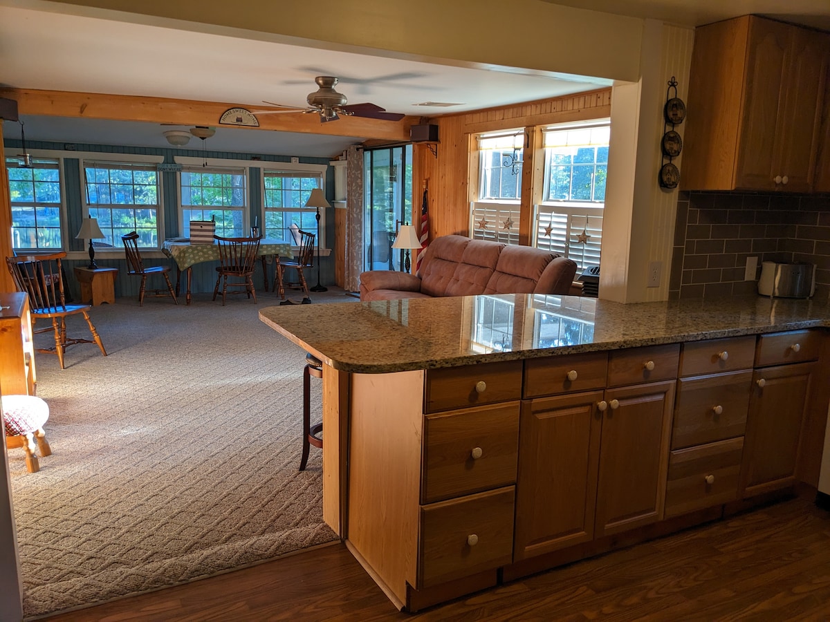Bring your family or group to this 3 bedroom 1+ bath place in the large trees with lots of room for relaxing and fun (….if you are a jeans and sweatshirt kind of person. It is not the Hilton!) TVs in each room, and 2 covered decks. Fish, or just sit out on the dock, watch the boats run by, and appreciate the lake. We rarely use the dock ourselves. 600’ from our public boat ramp with a park and small beach. Please also note that we do have cameras installed that monitor outside only.