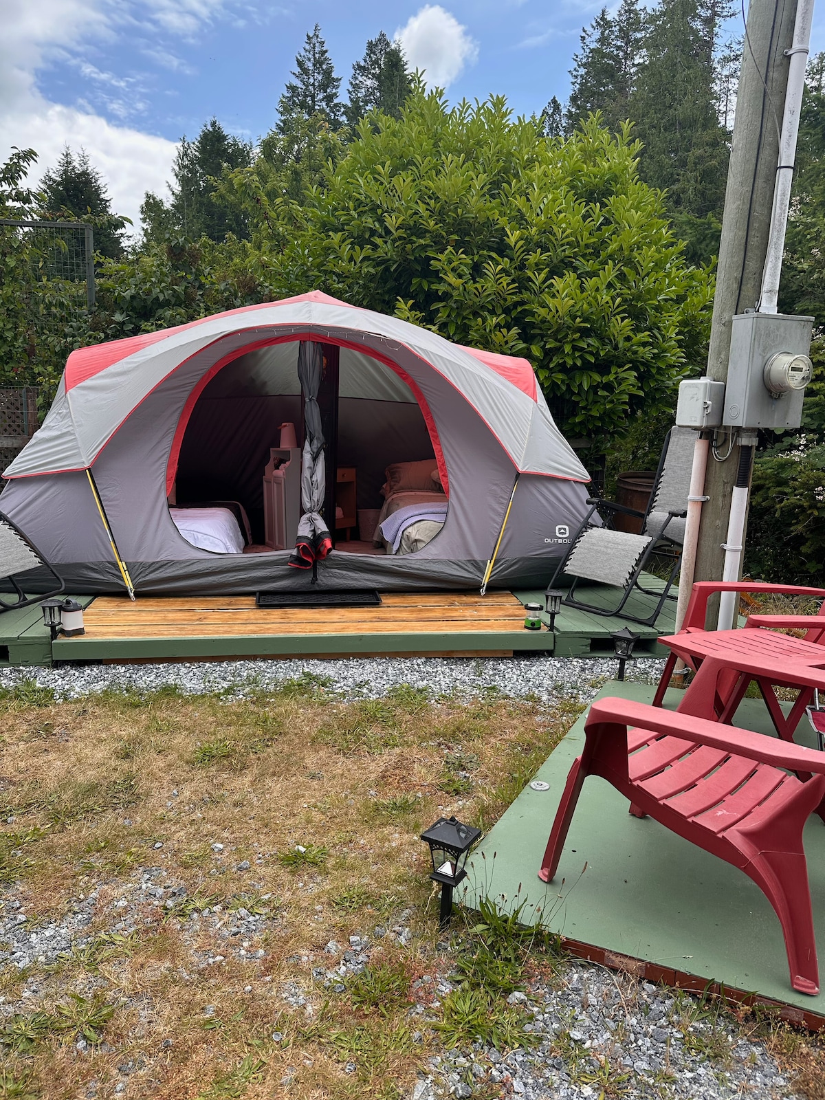 Ta rezervacija vključuje dva velika luksuzna šotora za glamping na vašem zasebnem kampu, ki se nahaja v gozdu Sooke Hills.* Pohod/kolesarjenje od kampa do 57 km določenih pohodniških/gorskih kolesarskih poti, ki vodijo do več jezer in osupljivih razglednih točk! Uživajte v kopanju v svetovno znanih naravnih bazenih Sooke Potholes (10 minut vožnje), jahajte konje vzdolž čudovite večnamenske poti Galloping Goose, ki se razteza od Victorije do Sooke, ali pa se sprostite ob obrtniškem pivu v pivovarni Oceanside Brewery, ki je oddaljena le 10 minut hoje.