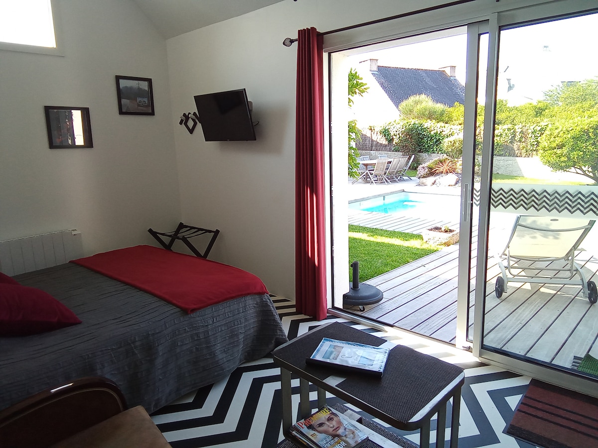 Med kopnim in morjem. Svetel, udoben, dobro opremljen, neodvisen studio; idealen za eno osebo (počitnice, poslovno potovanje) ali dve. Upoštevajte strmo stopnišče. Nahaja se v občini v osrčju narave (Blavet 600 m), trgovine, restavracija, avtobus, kino, gledališče. Idealno izhodišče za pohodništvo, kolesarjenje po vlečni poti, obisk Lorienta, okolice, čudovitih plaž 20 minut stran (Gâvres). + miren vrt z mizo, stoli, ležalniki, senčnikom!